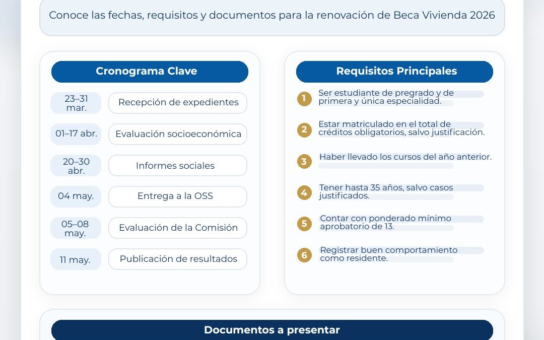 13 de marzo de 2026La Universidad Nacional Mayor de San Marcos inicia la convocatoria para la renovación de la Beca Vivienda 2026, dirigida a estudiantes residentes universitarios beneficiarios.